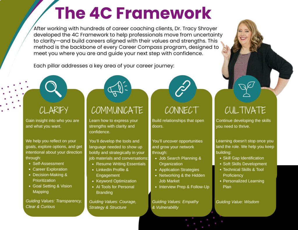 After working with hundreds of career coaching clients, Dr. Tracy Shroyer developed The 4C Framework to help professionals move from uncertainty to clarity, and build careers aligned with their values and strengths. This method is the backbone of every Career Compass program, designed to meet you where you are and guide your next step with confidence.